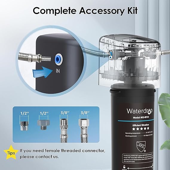 Compatibility: Suitable for faucets with 1/2" or 3/8" FEMALE NPT thread. If a female threaded connector is needed to connect to your faucet, please contact us BEFORE purchase. Less than $25.99 per replacement filter (Search " B085G66JTZ "on Amazon), save over 50% of cost on subsequent use. [After Sales Assistance] Waterdrop Backs the WD-10UA's high-end technical performance with a comprehensive prorated performance service; should a quality issue arise with the filter, you can contact us. [Deep Filtration and IAPMO Certified] Based on independent testing, this filter can efficiently reduces PFAS, PFOA/PFOS, large-particle contaminants such as rust, lead, chlorine, heavy metals, chemical impurities, and sand through thorough purification for clean drinking water. The filter is made of high BPA-free and lead-free materials. It also can successfully reduce chlorine, taste, and odor. This filter is certified by IAPMO against NSF/ANSI 372 Standard and NSF/ANSI 42 Standard. It can lower lead when tested by a third-party laboratory against NSF/ANSI 53 standards. Please use the "WD-10UA" search term to review the 42&372 certification on the IAPMO website. [Innovative Design] Only a cold-water source should be used to power the filter. Its twist-and-lock construction and push-to-connect fittings enable installation in three minutes, three second replacement, and safety-assuring integration. This filter comes with a 3/8" line that connects directly to US sinks' standard 3/8" feed water valves. The system is connected to 1/2" and 3/8" cold water pipes and faucets with the use of the 3/8"-1/2" convertor fitting. [Solve Clogging Problem] By upgrading the filtration area, our filter now provides a 20X increase in dirt adhesion area, enhancing filtration capability while minimizing the risk of clogging. [Filter Replacement and Long Lifespan] This filter system may be upgraded with a UF filter or a MZ filter to meet your water needs. It is compatible with several filters with various functions. Each filter system has a maximum service life of 12 months or 8k gallons when used with municipal water, which is sufficient to cover the needs of an entire household. [Wide Application] The filtration system was created for residential and commercial usage, and it can be installed in your kitchen, bathroom, RV, or office to satisfy your daily water demands. This under cabinet water filter is the finest option for a leased property due to its stunning design and compact size. It is perfect for drinking, cooking, skincare, and cleaning. It is suitable for faucets with a FEMALE NPT thread of 1/2" or 3/8". Please get in touch with us prior to making a purchase if a female threaded connector is required to connect to your faucet. ⭐TDS is not a professional way to measure the water quality. Essential Minerals, Calcium, Potassium, Sodium, Magnesium...These essential minerals are dissolved solids, PPM will not be dropping if you test with a TDS meter. Waterdrop undersink water filtration system is keeping all those minerals, but removes elements that are harmful to your body.⭐Note: The activated carbon is made from natural coconut shells. Please confirm whether you are allergic to it.