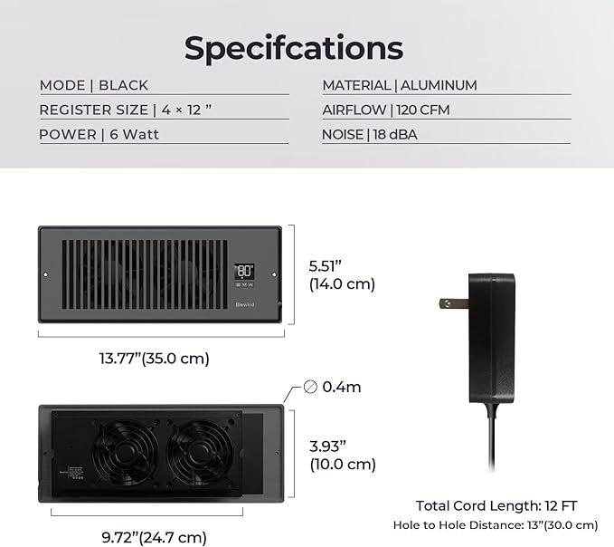 Quiet Register Booster Fan: A quiet fan system designed for improving wall and floor vents airflow from HVAC systems to increase home comfort. Eliminate Uneven Room Temperatures: Biowind smart register vent equipped with programmable LED controller and high-precision temp sensor to work with HVAC. It can automatically turn on/off vent fan to heat or cool the rooms at the right time. New Upgraded Remote Control: Remotely adjust the fan speed(0-10 level)to meet user different needs and make a perfect balance between noise and comfort. No need to get up, More convenient. Energy-Saving & Cost-Effective: This vent booster fans are more energy-efficient to traditional AC and cooling devices. They rely on airflow to improve indoor temperature and circulation, maximize the heating or cooling from your HVAC system with minimum energy. Besides, This smart register vent continues running after HVAC system off, pulling every bit of heat or cold air into your home. Help you save more energy & electricity costs. Compact & Easy to Install: Biowind smart register booster fan is small in size and easy to move or install,making them convenient to use. Fits ONLY 4" x 12" Register Vent| Rated power: 6W | AC Input: 100 to 240 VAC| Airflow: 120 CFM | Noise: 18 Dba | Includes Wall Adapter, plug and play. Affordable: Compared to large-scale air conditioning and cooling devices, booster fans are relatively inexpensive and affordable, making them accessible to ordinary households.