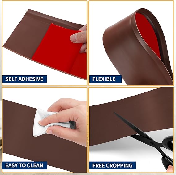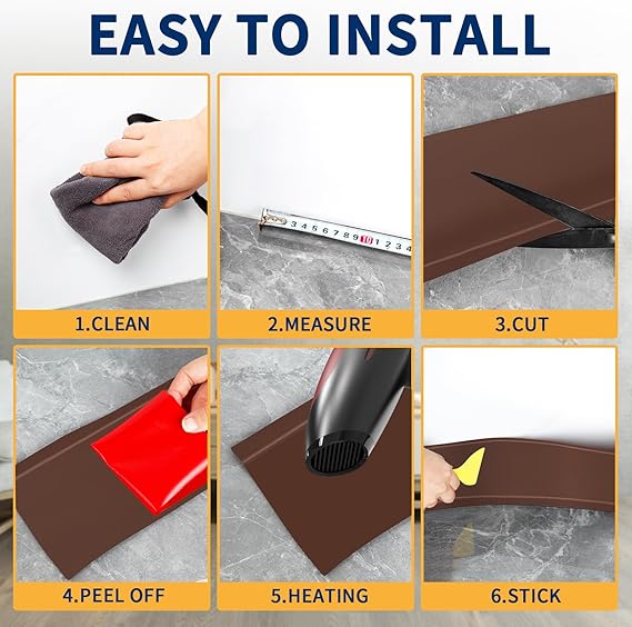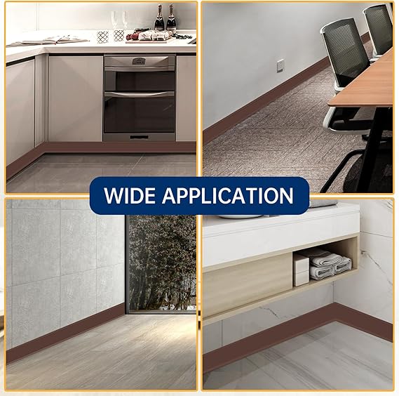 【SUPERIOR MATERIAL】Our peel and stick baseboard trim is crafted from high-quality materials, ensuring that they will not deform even after prolonged use. Additionally, the vinyl baseboard molding surface has special treatment to effectively resist scratches. When faced with wall corners, our products exhibit remarkable flexibility and can easily adapt to them. 【TOE DESIGN】 Featuring the toe design, this rubber wall base can resist dust while concealing blemishes and uneven surface for a flawless finish. And its smooth surface reduces stains and makes cleaning easy. This practical solution ensures a comfortable and safer living environment. 【ADHESIVE BACKING】 The wall baseboard molding is equipped with an impressively strong adhesive backing that eliminates the need for separate glue purchases. Its self-adhesive design makes it easy to install even for new users and without additional tools or assistance. 【EASY INSTALLATION】 Thanks to the self-adhesive design of the cove base, no screws or drilling are required. Begin by cleaning the surface, then measure and cut the vinyl baseboard to your desired length. Peel off the adhesive backing film and apply it to the smooth surface, pressing back and forth firmly until it is securely fixed on the wall. The installation process can be completed in a short time. 【WIDE APPLICATION】 The baseboard trim peel and stick is versatile and can adhere to almost any smooth surface like tiles, plastic, metal, glass, wood, and smooth walls. This makes it an ideal solution for uneven floors or irregular walls that cannot be addressed by conventional methods. It's perfect for covering gaps between floors and walls in garages, gyms, living rooms, bathrooms, bedrooms, kitchens, RVs, nurseries offices hospitals and during house renovations.