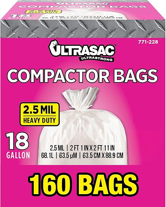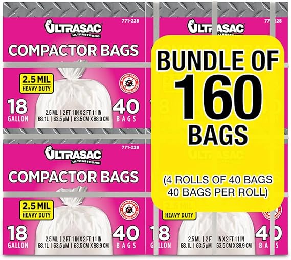 Ultrasac Compactor Bags - (160 Pack with Ties) 18 Gallon for 15 inch Compactors - 25" x 35" Heavy Duty 2.5 MIL Garbage Disposal Bags Compatible with Kitchenaid Kenmore Whirlpool GE Gladiator