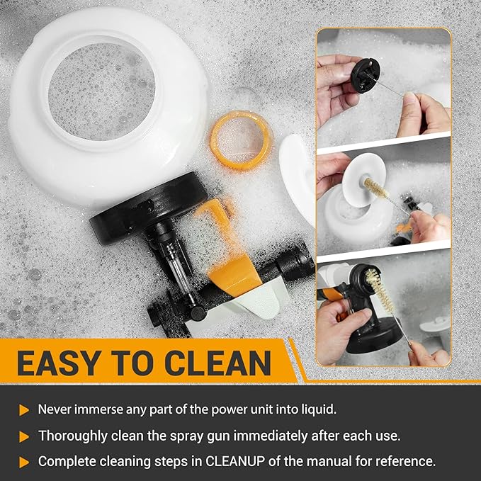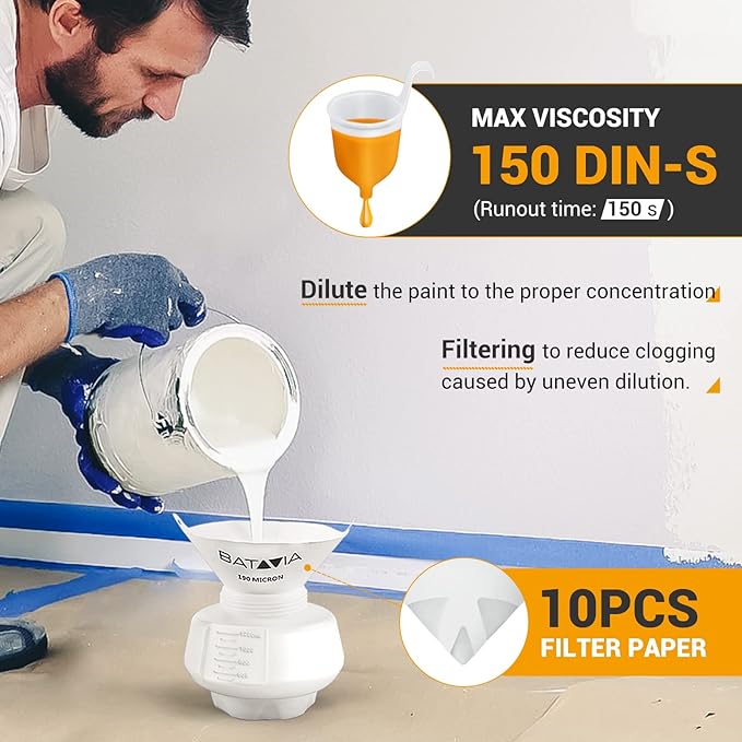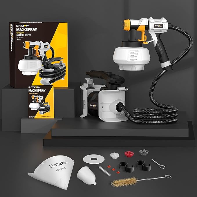 【PAINT SPRAYER FOR COUNTLESS DIY PROJECTS】BATAVIA paint sprayer offers the ultimate DIY experience, which is equipped with 700 watts of powerful spraying experience, makes it faster and more even. It's great for applying a great finish on small to large projects like home interior and exterior, furniture, fences, cabinets, doors, walls, ceilings, decks, dressers and more. 【SPRAY A VARIETY OF MATERIALS】The paint sprayer with max viscosity up to 150DIN supports spraying a wide variety of paints and stains such as chalk type paint, latex paints, lacquers, milk paint, enamels, primers, clear sealer, polyurethane, stain, varnish and so on. It also comes with a viscosity cup to easily measure paint thickness. 【LARGE WORKING AREAS】The split design supports a wide range of movement, with a maximum linear movement distance of 13FT and a working range of 530FT². The handheld part is only 1LB weight, as well as reducing the handheld weight, which is true time saving and high efficiency. 【ADJUSTABLE SETTINGS TO SUIT ANY PROJECT】You can adjust the air cap to spray horizontal, vertical, and round. You can also adjust the material flow control knob (Max Flow 1100ML/MIN) to quickly increase or decrease the material output. 【4 SPRAY NOZZLES OPTIONS】Spray nozzles offer superior performance. The 1.5mm&2.0mm nozzle are for thin paint like sealers and varnish, while the 2.5mm(black installed on paint sprayer)&3.0mm are for latex paint, chalk type paint, etc. 【ETL CERTIFIED& WARRANTY】It has ETL certification from the authoritative organization to ensure product quality and safety. We also support quick customer service within 24 hours and 18 months warranty service. If there is any question, please let us know immediately. We are always here for you!