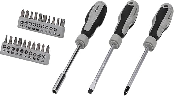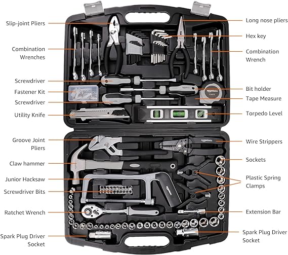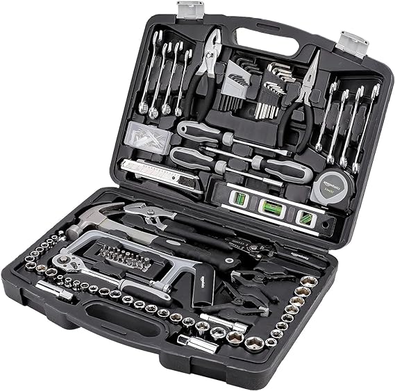 173-piece hand tool set for basic household repairs and everyday projects; includes 8 combination wrenches, 3/8-inch ratchet wrench, 22 hex keys, 6-inch slip-joint pliers, 6-inch long nose pliers, and more (scroll down to view complete list) Made of durable heat-treated and chrome-plated alloy steel for long-lasting, corrosion-resistant strength Plastic non-slip handles provide enhanced comfort and control Blow-molded case provides secure tool storage and convenient portability Measures 16.89 by 12.68 by 3.35 inches; backed by an Amazon Basics 1-year limited warranty Warning: Wear safety goggles to ensure your safety whilst using the hand hammer