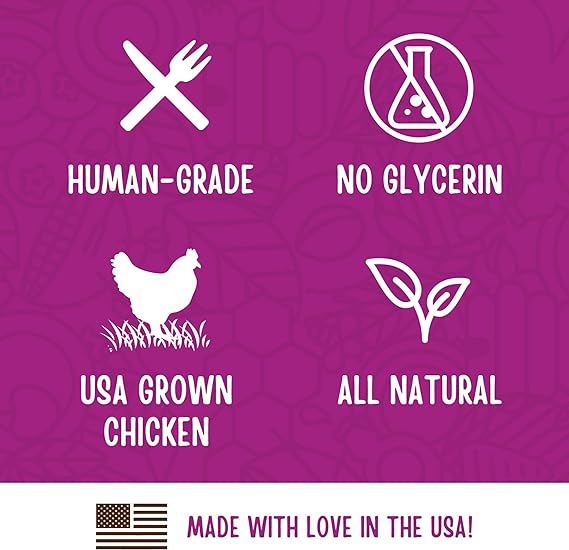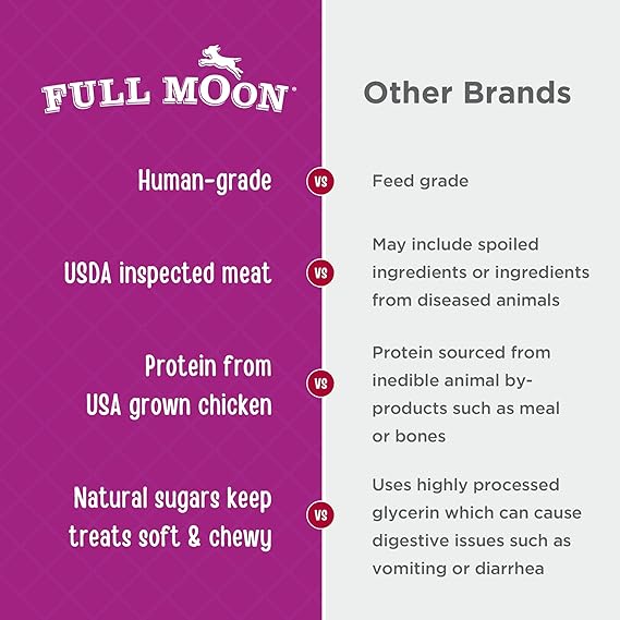 HUMAN-GRADE: If you wouldn’t eat it, why would you feed it? From the ingredients they’re made with to the kitchens they’re made in, our treats meet strict USDA standards fit for human consumption. ALL NATURAL: Our kitchen-crafted, Chicken Nuggets are made from USDA-certified, 100% all natural chicken raised in the USA. It's the bite size, soft, and chewy treat your dog will go bonkers for! HIGH QUALITY INGREDIENTS: Truth is our first ingredient. We carefully cook our Chicken Nuggets in small batches using honest ingredients like all natural chicken, ground celery, and rosemary extract—never any by-products or waste. NO GLYCERIN, GRAINS, CORN, WHEAT OR SOY: Our all natural treats are made from wholesome, healthy recipes. Every bite is free from fillers, artificial flavors, preservatives, and colors and chock full of real meat flavor. U.S.-GROWN CHICKEN: Full Moon treats are proudly made in the United States using regionally sourced ingredients, including USDA approved, antibiotic-free chicken.