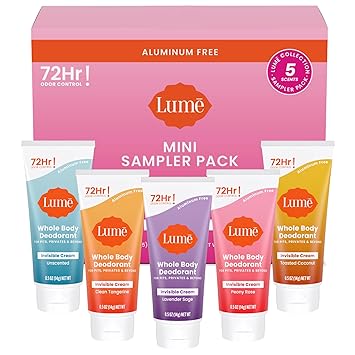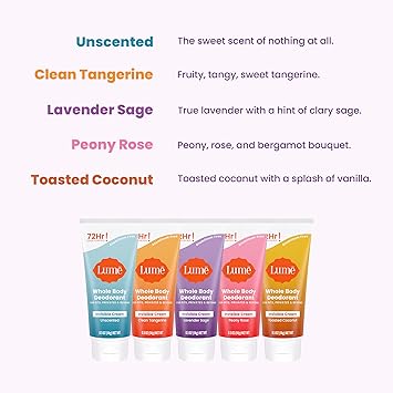 SMELL BETTER EVERYWHERE - Odor control for pits, privates and beyond—think feet, underboob, belly buttons, tummy folds, butt cracks, thigh creases or anywhere else you have odor but wish you didn’t. OUTRAGEOUSLY EFFECTIVE - Lume is clinically proven to block body odor all day and continues to control odor for 72 hours. POWERED BY SCIENCE - Rather than covering up odor after it forms, our formula is pH optimized to block odor before it starts. You could even call us a PREodorant! SERIOUSLY SAFE - Doctor developed for women and safe for any external use. Aluminum free, baking soda free, and paraben free. Hypoallergenic and skin safe for even our most sensitive parts. BOXED SET INCLUDES 5 SCENTS - Clean Tangerine, Lavender Sage, Peony Rose, Toasted Coconut, and Unscented. Perfect for gifting or trying new scents. Start with a pea sized amount and apply to any nook and cranny.