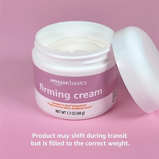 Includes one 1.7 ounce jar of Amazon Basics Firming Cream Hyaluronic Acid as a key ingredient improving skin's natural moisture for better looking skin Formulated without fragrance Apply evenly over entire cleansed face and neck This product is a thick cream that may shift during transit. Contents may appear reduced, but the jar is filled to the correct weight If you like Olay Regenerist Fragrance Free, we invite you to try Amazon Basics Firming Cream Running low? Restock by asking, "Alexa, order Amazon Basics Firming Cream" through your Alexa device