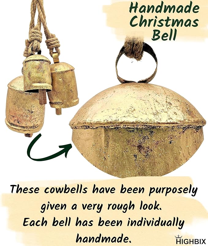Shabby Chic Rustic Style Vintage Lucky Harmony Cow Bells Wall Hanging Bells.???? ???? The golden color is actually a covering of brass. These bells are baked in fire giving them their unique shades of brown rustic color.???? ???? These cowbells have been purposely given a very rough look. Each bell has been individually handmade, hence small variations are possible. Made from recycled iron sheets. Metal with a worn paint finish.???? ???? Can be used for various purposes- to make Christmas wreaths, wind chimes, and wedding decorations.???? ???? Made In INDIA Product by Finest Indian Craftsmen.????