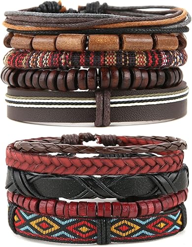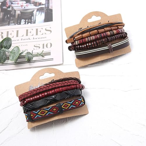 HZMAN Wrap Bracelets Men Women, Hemp Cords Wood Beads Ethnic Tribal Bracelets, Leather Wristbands