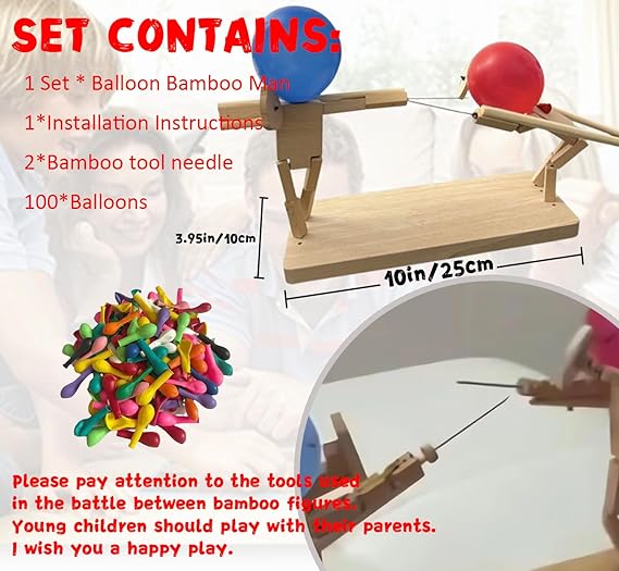 【 Balloon Bamboo Man Battle 】 Brace yourself for endless fun and laughter. In this crazy game each player tries to keep the balloon from popping, Guess who is the fencing champion? 【 Battle Between Balloon Man 】 This "Balloon Bamboo Man Battle" - an innovative and fast-paced wooden bots battle game crafted for two players. Let’s have an exciting balloon fencing battle!!! 【 Fun Two-Player Battle Between Balloon Man 】 Balloon bamboo man battle game-prick your opponent's balloon to win! Holding a sword and shield in each hand, the balloon man can be controlled to attack and block. 【 DIY your Balloon Man】: Paint your exclusive expression on the balloon to attract your opponent's attention. Defeat your opponent in one fell swoop and crown your Balloon Man as the king! 【 Durable Handmade Materials 】 Each puppet is meticulously crafted, showcasing superior artistry and durable bamboo construction, making every battle a visually stunning experience. If you are missing parts. Please don't worry, We're Here for You. We also carry extra colorful balloon sets, if necessary, please choose them as well!
