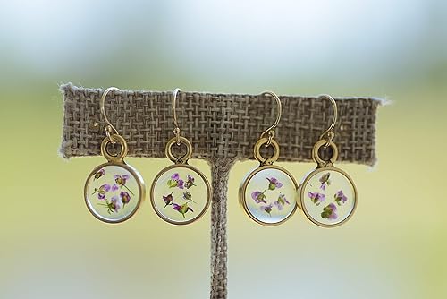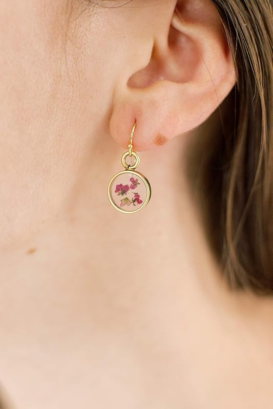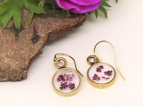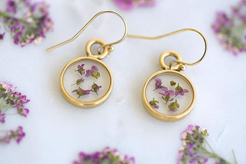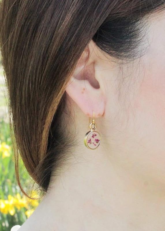 These real pressed Alyssum flower earrings are made with pressed Alyssum flower and set in jewelers resin. The dangle earrings are framed by a small gold-plated round-shaped bezel. Ear wire is 14K gold filled. These earrings are made with real flowers and no two flowers are the same. The flowers will have a slight difference in size and shape. Ear wire guards are provided so you can wear the earrings with confidence, knowing that the wire will stay in place on your ear. Length: 18.4 Millimeters Width: 6.4 Millimeters Drop length: 1 Inch Ear wire: 14K gold filled Handmade in USA