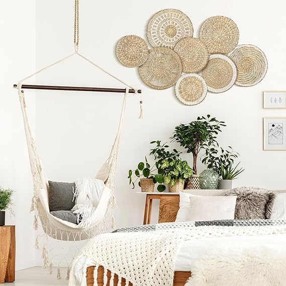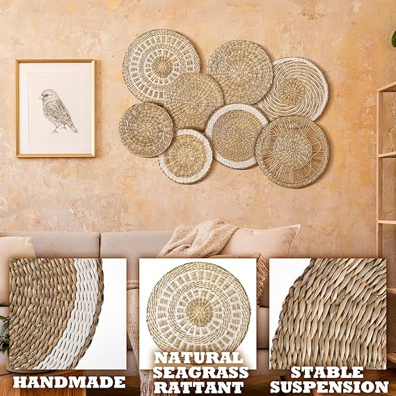 Embellish Your Space: basket wall decor set is a desirable alternative to artwork and prints, which will add elegance texture and create a modern natural aesthetic feeling to your space Abundant to Choose: you will receive 8 pieces of woven wall baskets in different styles, the sizes vary from 5.9 inch to 13.8 inch, suitable for wall decorating use, the quantity and sizes are enough for your daily needs and replacement demands, you can mix and match them as you need, making your furnishing styles more attractive Delicate Workmanship: woven wall decor is natural and hand woven, made of tan and white plastic cord, neutral colors are easy to match, each seagrass basket is finely handcrafted; When first opened, there will be a natural aroma, which will dissipate in a short time Wide Usages: basket wall art is sturdy and reliable to use, which can serve as a wall art decor, coffee table centerpieces, fruit baskets, storage baskets for small ornaments, available for bedroom, living room, kitchen, farmhouse, adding a bohemian feeling Convenient to Use: wall baskets decor Boho flat are easy to apply, each basket has a woven hook at the back, so you can effortlessly hang the basket on the wall, and displaying its beauty, impressing your guests with the bohemian style wall decoration