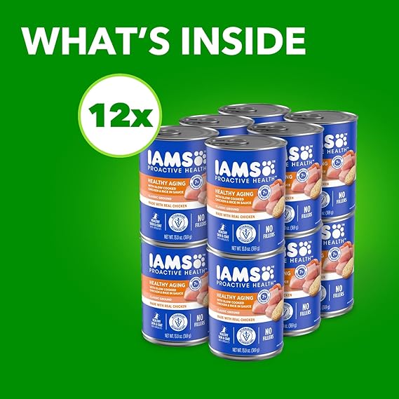 Complete and Balanced for Senior Dogs: This product is a complete and balanced meal for senior dogs that is made with real chicken as the first ingredient and is formulated to be lower in fat, higher in protein, and full of fiber Bone and Joint Health: Includes essential minerals like calcium, and natural sources of glucosamine and chondroitin for bone and joint health Mental and Visual Sharpness: Made with DHA Gold for mental and visual sharpness in aging dogs Boost Immune Response: Healthy Aging helps boost the immune response of older dogs to healthy adult levels Pack of 12: Contains twelve (12) 13 oz. cans of IAMS PROACTIVE HEALTH Healthy Aging Wet Dog Food Classic Ground with Slow Cooked Chicken and Rice