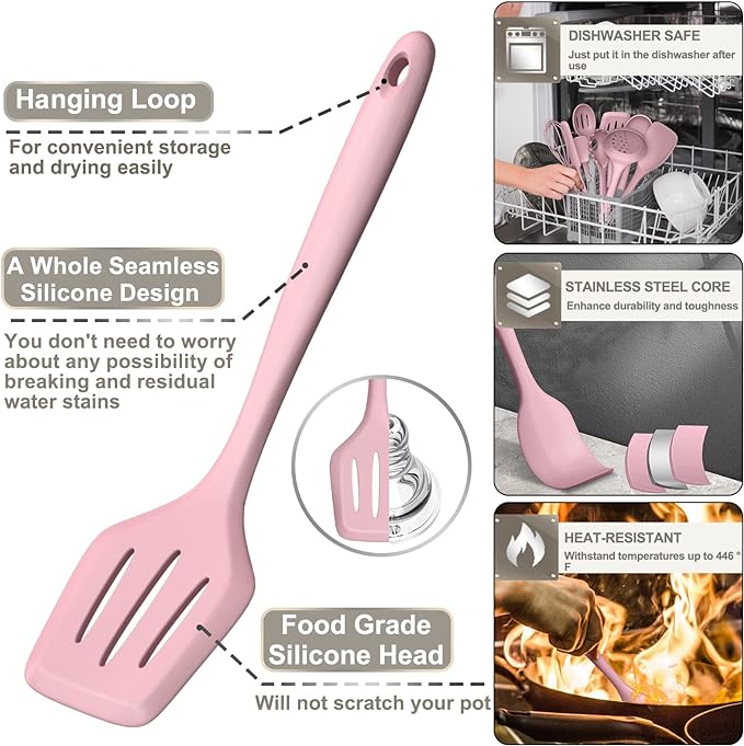 【FOOD GRADE SILICONE】Each kitchen utensil is made entirely of food-grade silicone and BPA-free. This silicone cooking utensils does not react with food or beverages. A set of excellent cooking utensils is related to the health of you and your family, therefore we choose more strict materials and quality inspection. Sweet tips: It is recommended to soak for half an hour before the first use and then expose to the air for about 3 hours, eliminate the original taste. 【STAINLESS STEEL CORE & NO GAPS, ONE PIECE DESIGN】 Each cooking utensil adopts the principle of an integrated stainless steel core to enhance durability and toughness, prevents the spatula from bending or deforming. The stainless steel is wrapped in silicone to form a whole seamless silicone design, you don't need to worry about any possibility of breaking and residual water stains. 【HIGHLY HEAT RESISTANT & NON-STICK COOKWARE】The silicone spatulas can withstand temperatures up to 446 ° F and has high-temperature oxidation resistance(even when used in high-temperature frying environments), you don't have to worry about is melting. The features of nonstick cookware and soft silicone head can protect your pot from any scratch, it is a good partner for a nonstick cookware. 【EASY TO CLEAN & DISHWASHER SAFE】It has a seamless silicone design which is an advantage as there aren't any cracks or ridges to catch food or harbor anything that makes it super easy to clean and use. Just put it in the dishwasher after use, and you will get a new set. This complete set of kitchen utensils is a highly creative gift that suits any kitchen needs and is a great helper for cooking, baking, and grilling! 【43 PCS KITCHEN UTENSILS SET & 43 INDEPENDENT FUNCTIONS】A set of 43 kitchen utensils can meet any cooking needs, we have carefully considered most of the scenes needed for kitchen use. Carefully selected such as: Slotted turner, Solid Spoon, Soup Ladle, Pasta Serve, Whisk, Brush, Kitchen Tong, Pizza Cutter, Grater, Measuring Spoons, Measuring Cups, etc. If you have any questions about this package, please feel free to contact our customer service and we are always at your service!