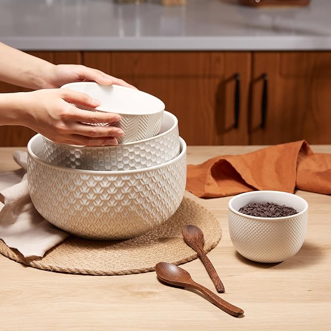 Nesting Bowls: Mix it up with this set of small, medium, large and extra large nesting bowls! Perfectly sized for prepping, styled for serving, and nests snugly for space-saving storing Salads, Snacks & Beyond: These versatile bowls are perfect for serving saucy pastas, big leafy salads, hot soups, buttery popcorn and everything in between Narbonne Collection: Made from durable and glossy cream stoneware. Each bowl is embossed with a geometric pattern and finished with dark copper accents. The set includes 20/44/98/145 oz bowls Easy Clean: These bowls are sturdy, odor & chip resistant. Use them to store leftovers in the freezer or reheat food in the microwave. Pop into the dishwasher for easy cleanup! The Kook Promise: We’ve carefully packaged each bowl with custom polyfoam molds to ensure it arrives in perfect condition