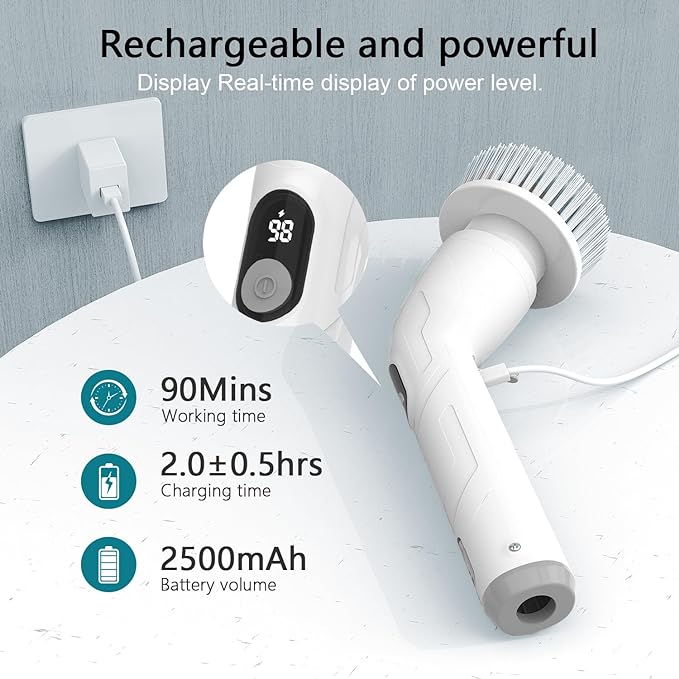 ✅【Save Time And Effort】 Upgraded Electric Spin Scrubber Cordless gets rid of the troubles caused by traditional cleaning tools. it can be used anywhere you want. This spin scrubber is super lightweight and very easy to pick up and use to clean surfaces without getting tired and drastically reduce your work time from 1 hour to 30 minutes. ✅【Powerful & Efficiency】The internal motor drives the rotating brush head to rotate at a high speed up to 450RPM±10%, can help you easily clean your entire house,especially when used with a cleaning agent, it can quickly clean stubborn stains and make entire house look new! Perfect for bathroom,bath tub,stone tile floor,grout,grooves,Toilet & etc. ✅【2 Adjustable Speed & IPX7 Waterproof 】You can easily clean your entire house in one fell swoop with this cleaning brush ,it set has 2 working speeds, I: Low Speed: 350RPM/Min; II:High Speed: 450RPM/Min; What you need to do is press the ON/OFF button once. The entire machine is IPX7 waterproof,you can wash the electric scrubber directly into the faucet without worrying about product damage. ✅ 【4 Replaceable Brush Heads】TUYU electric spin scrubber has equipped with 4 cleaning heads, a hard flat brush for large surfaces, a corner brush for curved areas, a small flat brush for detail work, and a pointed brush for gaps. All the brushes have long bristles that resist shedding and won’t scratch surfaces. which can be suitable for bathroom, kitchen, table, bathtub, floor,windows and Car various scenarios to meet most of your requirements. ✅【Adjustable extension Rod】The electric shower scrubber equipped with extendable stainless-steel handle . The handle can freely extends from 26 inches to 45 inches easy to clean hard-to-reach places, without kneeling or bending over. Say Goodbye to Traditional Cleaning Tools.A new type of household cleaning tools that can change your life! ✅【LED Display & Fast Charging 】Equipped with an LED digital display of battery usage,you will never need to worry about running out of power. The electric spin scrubber used fast charging technology, equipped with Type C charging port ,you can recharge it easier.Indicator light will be red when it's charging and get green when it's full. ????【Perfect Gift For Family And Friends】Portable cordless hand-held shower scrubber is ergonomically designed, you can use the electric cleaning brush to do housework in the most relaxed posture, no need to bend down and kneel to clean, take care of your waist and joints, save time and effort. it is an ideal gift for family, parents and friends, make housework a fun.