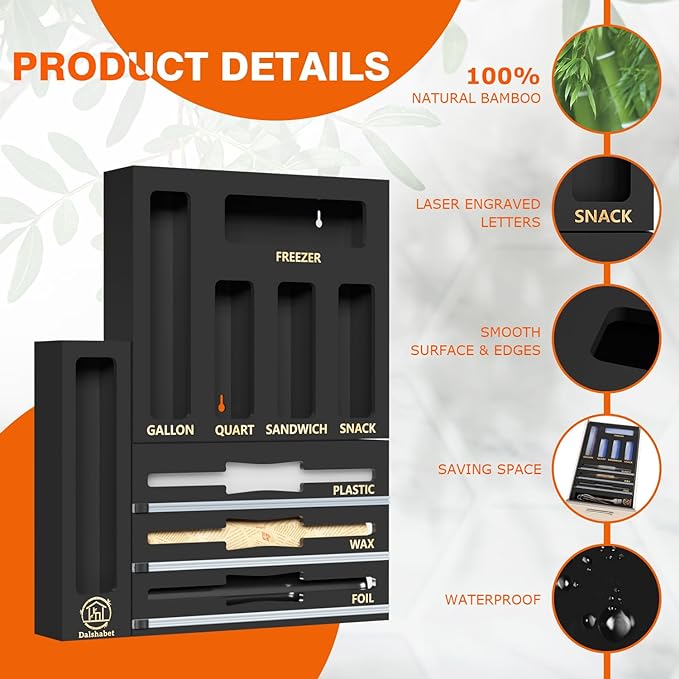 TRANSFORM CHAOS into ORDER: Tired of struggling with cluttered drawers that jam every time you try to open them? Revolutionize your kitchen organization with the DALSHABET 9-in-1 Bamboo Kitchen Organizer, this versatile organizer is designed to enhance your kitchen storage experience. MAXIMIZE YOUR SPACE: Take back control of your kitchen space with this innovative organizer. It's the ultimate clutter-busting solution, neatly storing Storage bags, foil, plastic wrap, wax paper, and more. Say goodbye to messy countertops and cluttered drawers. All-in-One Baggie & Wrap Organizer: This versatile set includes a 3-in-1 foil and wrap dispenser with a cutter, designed for aluminum foil, plastic wrap, and wax paper. It also features a food storage bag organizer that accommodates sandwich bags, quart bags, snack bags, and gallon bags. Plus, a drawer organizer storage box for your clips or small items. CRAFTED from 100% NATURAL BAMBOO: Our plastic wrap dispenser is constructed from premium bamboo, known for its durability and eco-friendliness because the bamboo is renewable, The superb craftsmanship ensures it will stand the test of time while adding a warm, natural touch to your kitchen. DETACHABLE & CONNECTABLE DESIGN: This storage bag organizer is designed with flexibility in mind. It can be connected to hang on the wall or detached for placement in your drawer or on your countertop, depending on your space requirements. Organize your wrap rolls and food storage bags conveniently and efficiently. The Perfect Gift: Looking for a thoughtful gift idea? Our Aluminum Foil Organization and Storage Set is a fantastic choice for various occasions, including Mother's Day, housewarming parties, birthdays, and Christmas. It's a gift that will be appreciated by anyone who loves organization and values a well-kept kitchen.