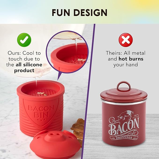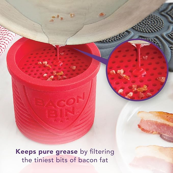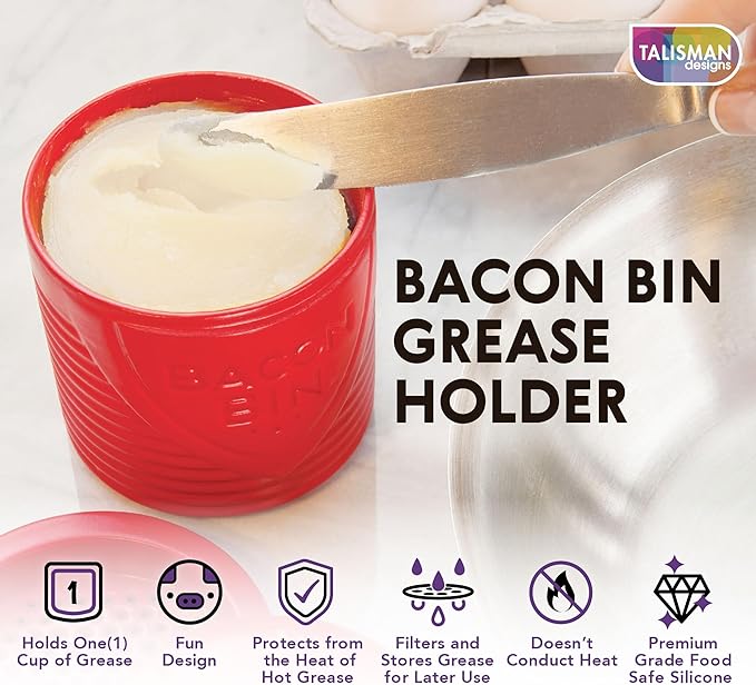 Talisman Designs Bacon Bin Grease Strainer & Collector | Family Friendly Kitchen Tools | Fun & Functional Silicone Grease Container | Holds up to 1 Cup | Red
