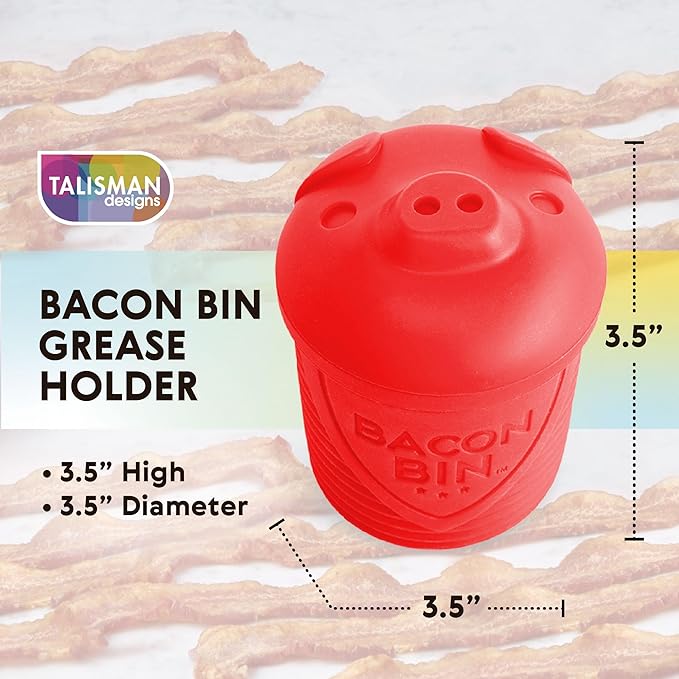 BACON BIN SILICONE GREASE CONTAINER: Talisman Designs charming Bacon Bin Grease Holder is a fun way to safely strain, cool, save, or dispose of used bacon grease on the countertop or store in the refrigerator. STRAINER FOR BACON BITS: Created with a removable strainer that sits on top, the bacon grease catcher separates small bacon bits from used grease. Strain and clean pig grease for future cooking or prevent clogged pipes by cooking grease before scooping out for disposal. HEAT RESISTANT MATERIAL: This BPA free bacon grease container is carefully constructed to be heat resistant up to 500-degrees Fahrenheit to hold hot grease without melting or spilling. The heavy-duty, non-stick material resists stains and odors. FUN & FUNCTIONAL DESIGN: This cute container is perfect to leave on your counter while holding up to 1 cup of grease. It measures 3.5 inches by 3.5 inches with easy care in the dish washer and is safe in the freezer, refrigerator, and microwave. FAMILY FRIENDLY KITCHEN SUPPLIES: Talisman Design’s Fun & Funky products create an enjoyable environment for baking and cooking to be easy and fun. Have kitchen supplies that are functional, effective, and durable for long lasting use.