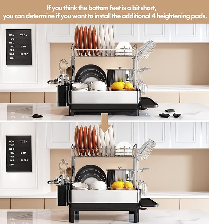 ✅Double-layer Large Capacity: The dish rack with a 2-tier design is suitable for large families. The upper one is for plates and small frying pans; the lower one can be used to put bowls, cups and full-sized pots and pans. The utensil holder has 3 separate compartments to fit knives, forks and spoons. The wine glass rack is another surprising delight. So altogether it makes perfect for kitchen to dry the daily used stuff. ✅360°Rotating Telescopic Swivel Spout: Clever design- practical drainer can catch any water and drain it automatically. No need to pour the water out manually! The integrated drain board is high capacity and has a drain spout that rotates 360° so you can put the rack next to the sink in the best position for your needs, and have it work. ✅Sturdy & Stable: One of the effective features of our durable dish drying rack is solid and heavy-duty for long-term use. It can hold up to 110lbs thanks to the strong material. This Dish Rack and Drainboard Set is very stable! There isn't even the slightest bit of wobble when you put many big plates and soup pots on it. ✅100% Rust-Proof & Anti-scratch: Made of food-grade 304 solid stainless steel, after the polishing and welding process, it becomes more durable than other dish strainers. The dish drainer is anti-rust, oil-proof, fingerprint-proof, and oxidation-proof. The whole rack is so smooth that you don't have to worry about hurting your hands. ✅Assemble Easily & additional 4 heightening pads: Very sturdy rack. Very easy to assemble. Size is perfect, 16.54(L)*12.6(W)*16.6(H) inch, will accommodate a lot of tableware on two tiers to keep dishes organized and really helped decrease counter clutter in your kitchen. If you think the bottom feet are a bit short, you can determine if you want to install the additional 4 heightening pads.