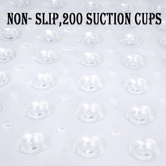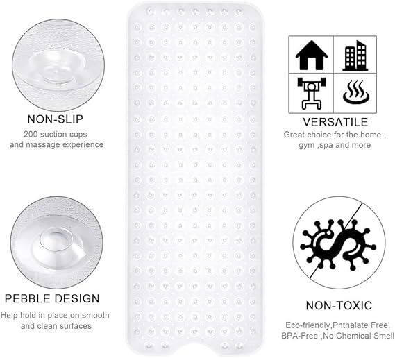 Vinyl Extra large bathtub mats: No chemical smell, vinyl quality material. Heavy duty and standard dimensions and rectangle's shape makes it lays flat in any smooth bathtub floors. Non-slip shower mats with hundreds of suction cups: YINENN anti-slip bath mats features 200 suction cups that help hold in place on smooth surfaces. Powerful suction cups offer 360 degree safety protection for users. YINENN bathtub mat is a great choice for the home, gym, spa and more! Multifunctional and utility: looks like pebble design, provide massage experience in shower time as it comes with 200 suction cups, featuring necessary anti-slip function, meanwhile YINENN extra large mat is 40 inch x 16 inch which provides excellent coverage and also features small holes throughout to allow water to circulate. Machine washable: YINENN bath mat consists of 176 drain holes, machine washable to facilitate hassle-free maintenance. To clean at any time, simply toss the mat into the machine and enjoy its fresh appearance. Air dry for years of safe, healthy, hassle-free to use. Warning: YINENN bathtub mat only attach to smooth and clean surface. Don't for use on textured, tiled, or non-smooth surfaces. Do not use bath oils in case of slipping.It's recommend to allow the mat to air out in a well ventilated area for 24 hours before use if you encounter a strong odor when the package is first opened.