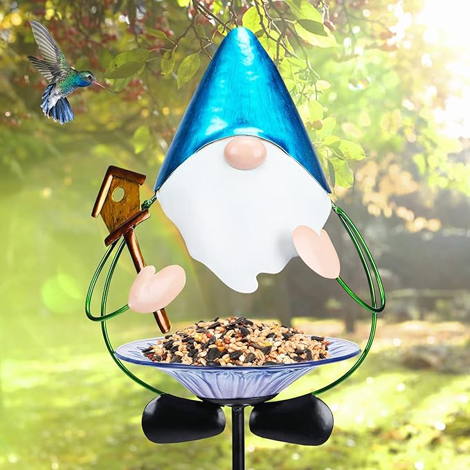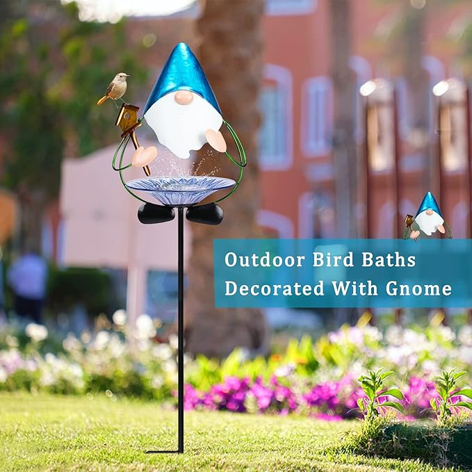 Garden small bird bath bowl holding some water or wild bird food can help to attracting birds to stay, making your yard more vivid with full of variety. Relax to watch cute birds feed in your backyard Birdbath has unique design, added with gnome decorations make it more funny in your yard and equipped with metal stake move glass bird bath to place the perfect spot effortlessly Bird bath is made of durable glass and metal material, small bird feeder bowl with funny metal gnome decoration is suitable for outdoor garden yard lawn outside flower bed Easy to use and make it clean, used as a bird bath for holding some water or a bird feeding tray for holding some seed, suitable as a gardening gift for mother, grandma,all of the nature lover 32 inch height birdbath includes: 1*glass birdbath bowl+2*metal stake part+1*metal gnome decoration+1*assembly instructions. If you have any doubt about gnome birdbath, CONTACT US by email please, we will deal with it asap