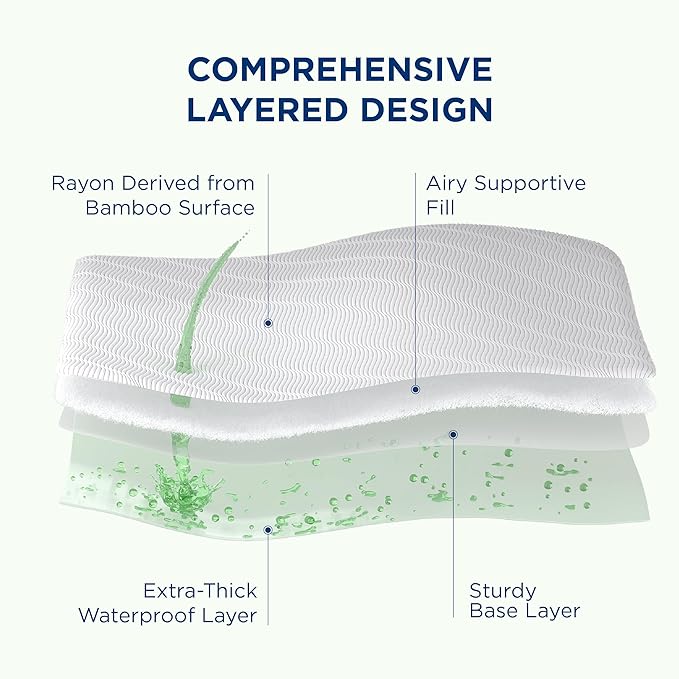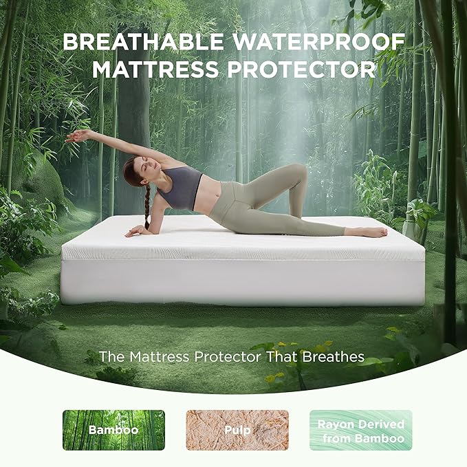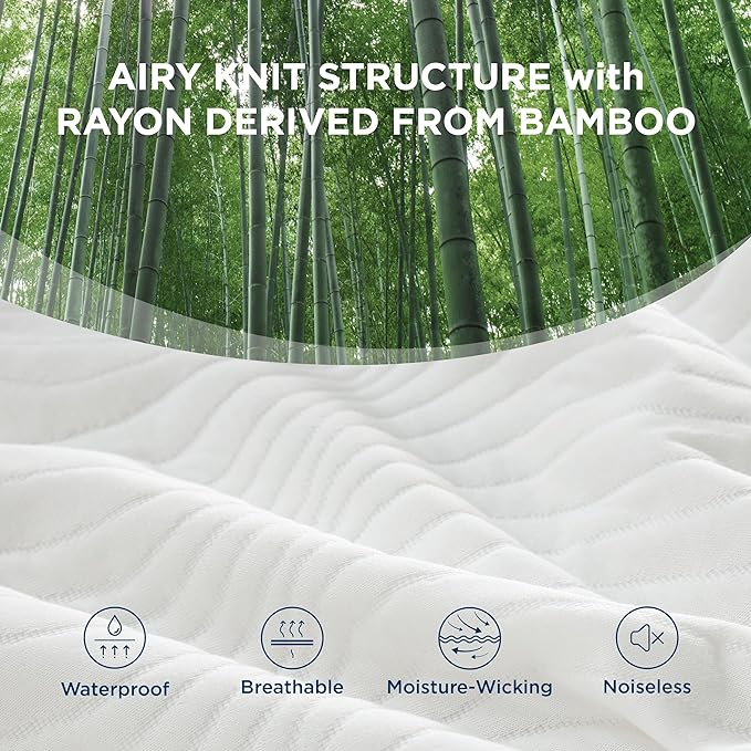 EXTRA-THICK WATERPROOF LAYER like never before: We've increased the thickness of the waterproof layer to prevent liquid leakage and overflow from damaging your mattress. Extra Wide, Extra Waterproof: This mattress protector has wider waterproof layer ensures that liquids will not seep into the mattress from any direction. Comprehensive Layered Design: Our mattress protector features a four-layer structure including a extra-thick waterproof layer. The innovative design offers superior protection against spills and accidents, ensuring your mattress stays dry and clean. Air Knit Structure With 45% Rayon Derived From Bamboo: Our waterproof mattress protector features an advanced air knit structure for enhanced breathability. Crafted with 45% rayon derived from bamboo fibers, this layer offers exceptional moisture-wicking and temperature regulation, ensuring a comfortable and sweat-free sleep all night long. Wash and Care Tips: Our mattress protector is easy to care for – simply machine wash and dry. For better drying results, position the top layer outward and ensure the waterproof layer faces inward. This makes it a practical choice for everyday use. Dreams Protected, Sleep Perfected.