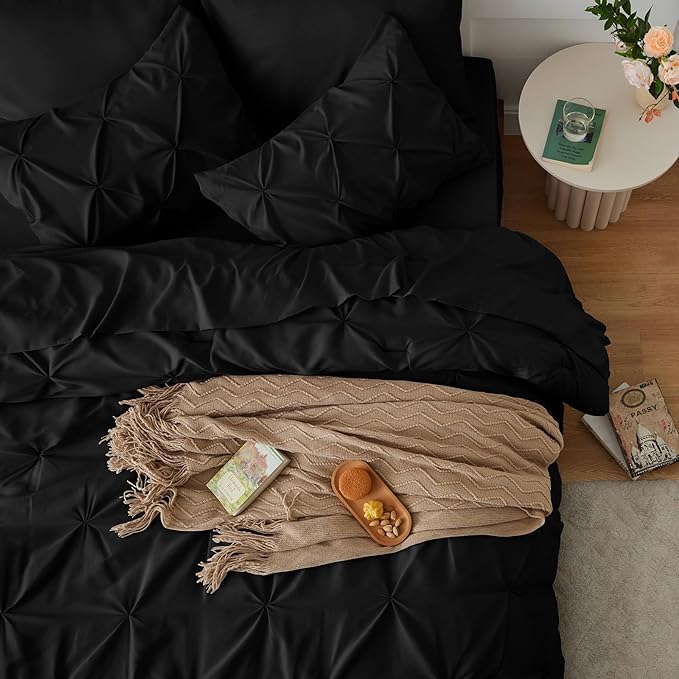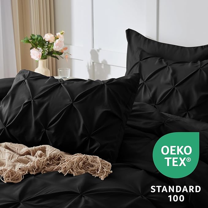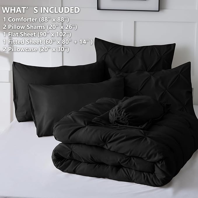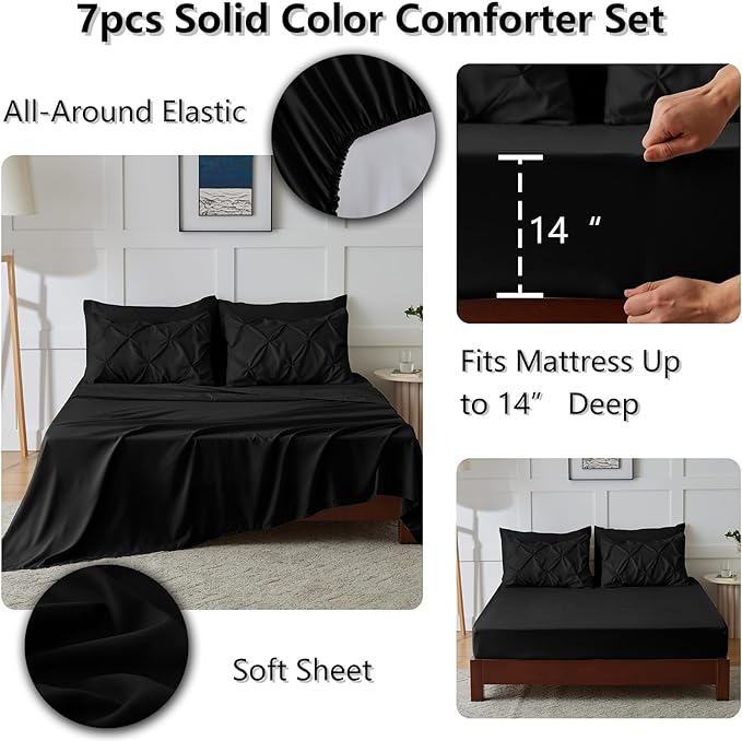 Queen Bed in a Bag Set 7 Pieces Bedding Set Pintuck Queen Bed Comforter Set Pinch Pleat Queen Size Bed in a Bag Black