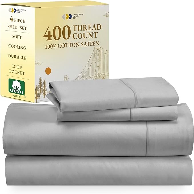 California Design Den 100% Cotton Sheets - Softest 4-Pc Cooling Sheets for Bed, Deep Pockets, 400 Thread Count Sateen, Bedding Sheets & Pillowcases,Queen Sheets (Light Gray)
