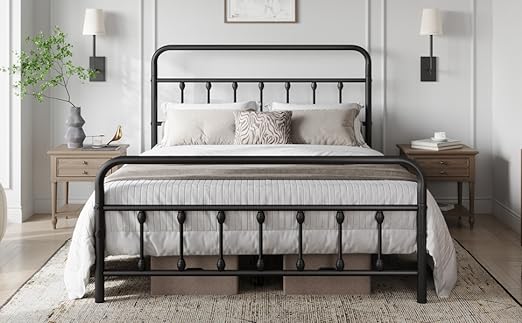 STRONG AND DURABLE: This robust bed base is fully constructed of metal frame for large load-bearing capacity. Reliable frame features 12 metal slats between two sides which provides you with strong support for a relaxing sleep. The powder-coated surface features medium rust and scratch resistance for long term use. Besides, not shaky after proper assembly. CLASSIC AND ROMANTIC: This farmhouse styled bed features curved lines and thick tube frames, bringing a romantic and warm feeling to your space. The beautiful silhouette subtly balances the coolness of metal that is easily blended with modern, traditional, farmhouse and rustic home decors. HIGH HEADBOARD DESIGN: Compared with other metal beds, this classic bed frame has a higher headboard for better protecting your head and providing you a comfortable sitting place. You can prop soft pillows behind your back, and read books or watch TV lazily. SAFE: Carefully designed, this mattress foundation is built of round corners, smooth finish and protective footpads, which is safer for our customers to use. Moreover, the high foot board keeps bedding from falling onto the floor while you sleep. QUICK ASSEMBLY: We provide all the necessary hardware and tool, and an illustrated installation manual to help you set up this iron bed frame. Should you have any questions, please feel free to contact us!